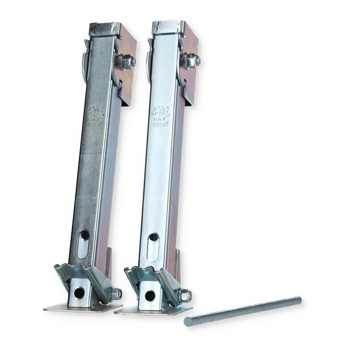 Schaffen einen sicheren Stand auf jedem Untergrund, durch stufenlose Höhenverstellung. Die Stützen können an die Rahmen- oder Chassiskonstruktion angeschraubt werden. Einfache Handhabung, kein Kurbeln mehr. Rechts oder links montierbar. Aus schwarz pulverbeschichtetem Stahl. Stützkraft 450 kg pro Stück. Preis pro Paar. Lange Ausführung. Eingeklappt 43,6 cm, ausgezogen 56,5 cm.