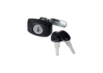 Rechteckiges Klappenschloss mit Zunge und Zylinder FAP New System Technische Daten: Farbe: Schwarz Lieferumfang: Knebelverschluss mit Schlüsseln und Zylinder