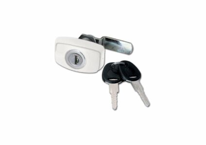 Rechteckiges Klappenschloss mit Zunge und Zylinder FAP New System Technische Daten: Farbe: weiß Lieferumfang: Knebelverschluss mit Schlüsseln und Zylinder