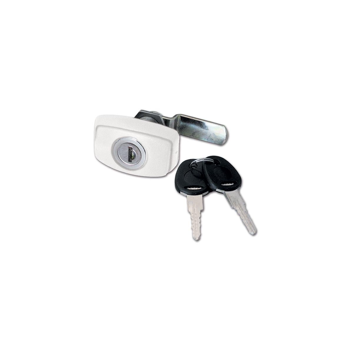Rechteckiges Klappenschloss mit Zunge und Zylinder FAP New System Technische Daten: Farbe: weiß Lieferumfang: Knebelverschluss mit Schlüsseln und Zylinder