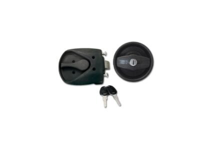 Komplett-Kit schwarzes Wohnwagenschloss inklusive eines traditionellen FF1 Zylinders samt Schlüsseln. Technische Daten: Maße: Innen: H 125 mm x B 145 mm Außen: Ø 100 mm Farbe: Schwarz Lieferumfang: Schloss (Innen & Außen) Zylinder & 2 Schlüssel