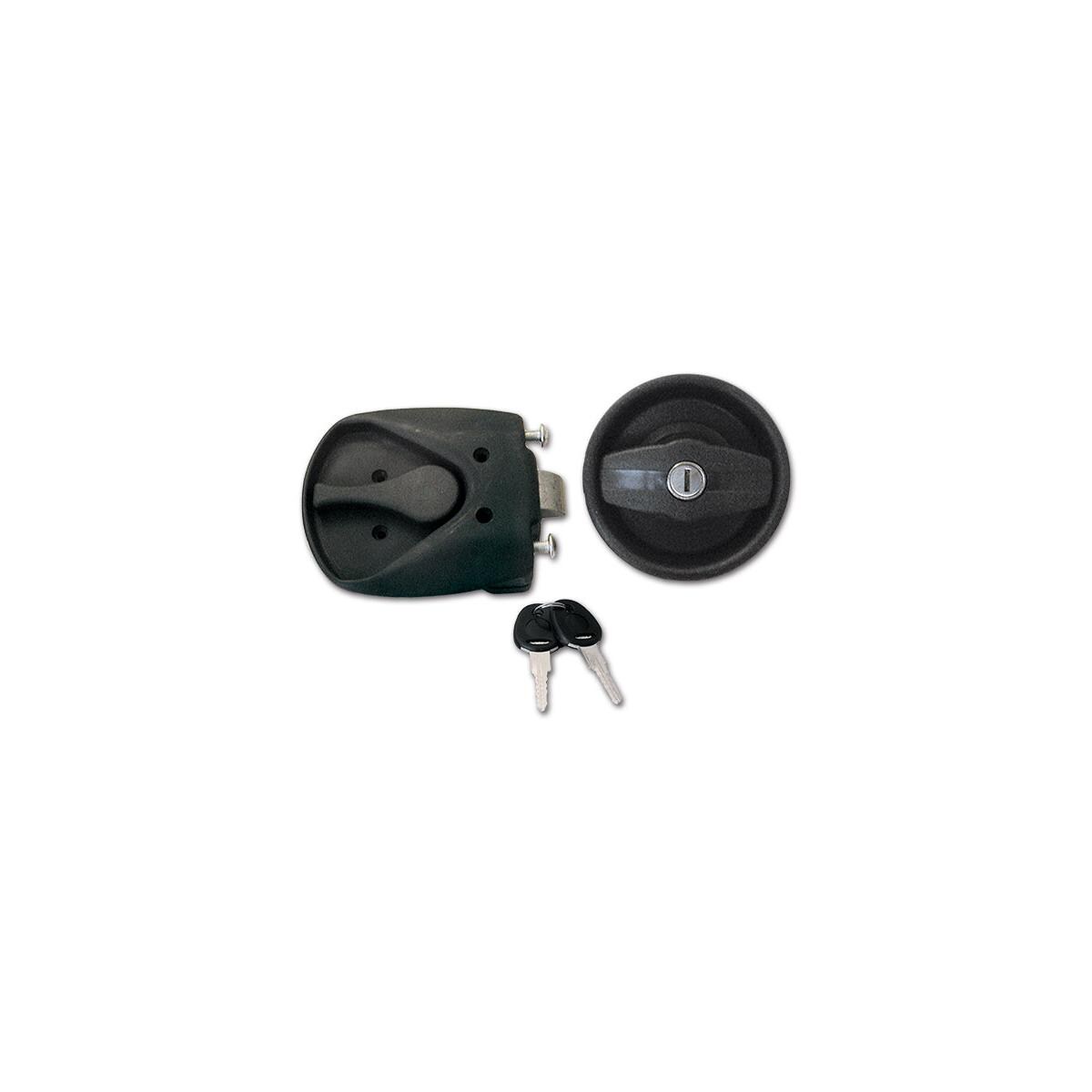 Komplett-Kit schwarzes Wohnwagenschloss inklusive eines traditionellen FF1 Zylinders samt Schlüsseln. Technische Daten: Maße: Innen: H 125 mm x B 145 mm Außen: Ø 100 mm Farbe: Schwarz Lieferumfang: Schloss (Innen & Außen) Zylinder & 2 Schlüssel