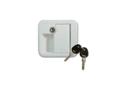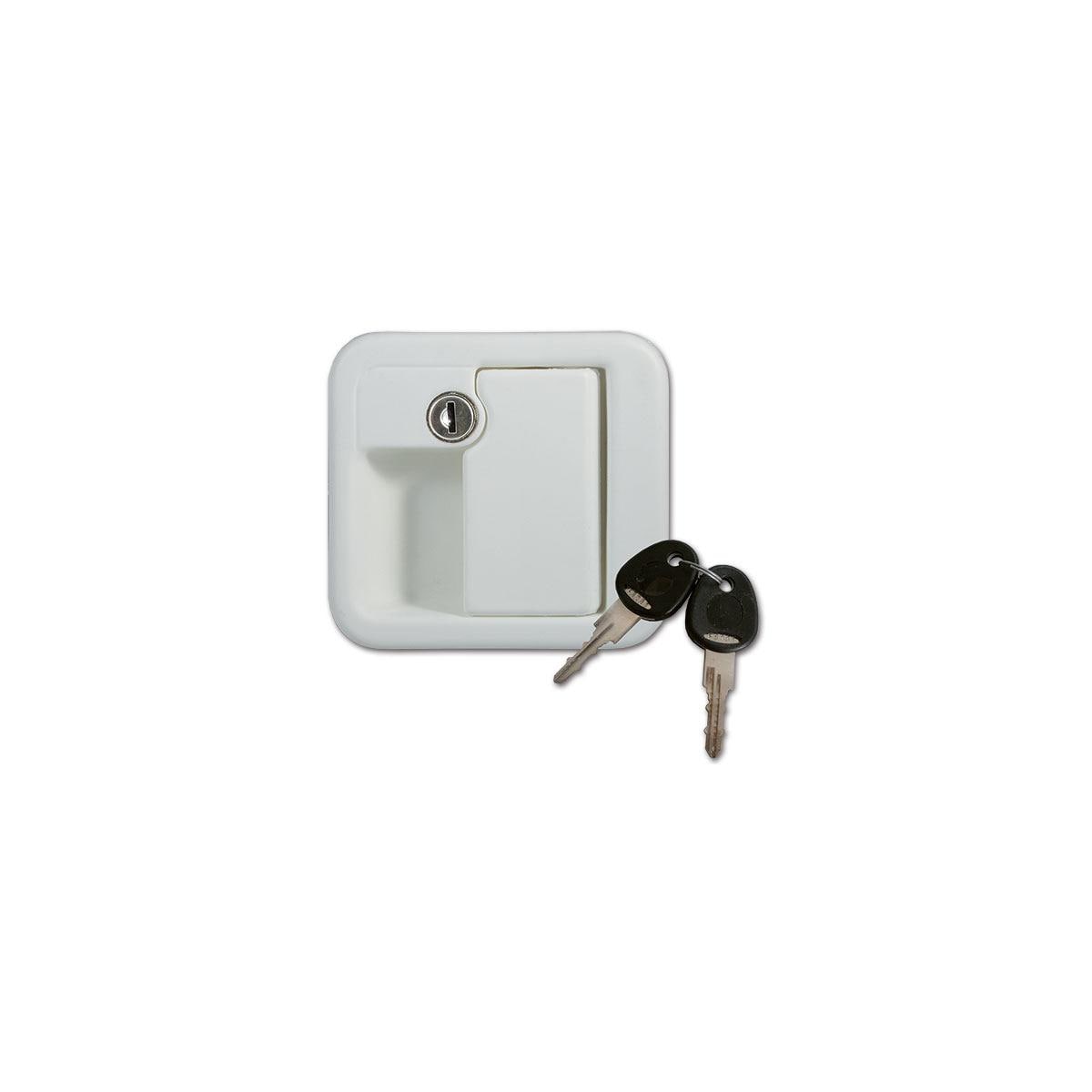 Türschloss für Wohmobile und Wohnwagen (Pro-Tek), weißer Außengriff mit M1 Schlüssel und Zylinder. Technische Daten: FF-System HSC (New System) Außenteil Breite: 120 mm Höhe: 130 mm Farbe: Weiß Lieferumfang: Außenschloss 2x Schlüssel & Zylinder
