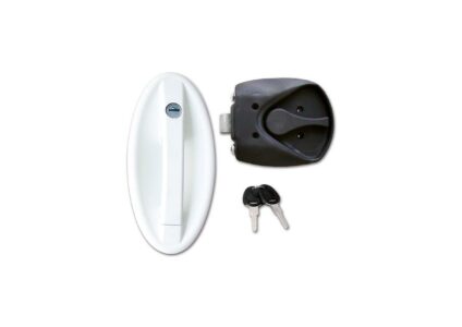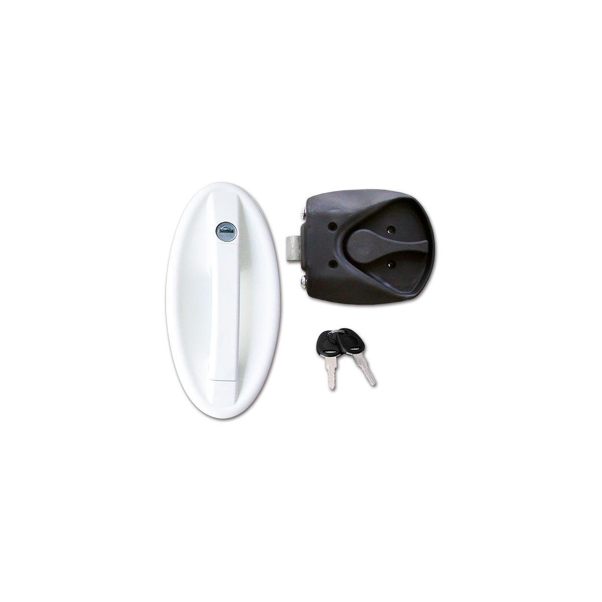FAP Reisemobiltürgriff mit Mulde komplett mit Schlüsseln und Zylindern des gleichschliessenden FF-System HSC (New System) Farbe: Außen: Weiß Innen: Schwarz Lieferumfang: Schlossteil Innen & Aussen inkl. Schlüssel & Zylinder
