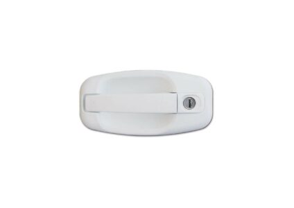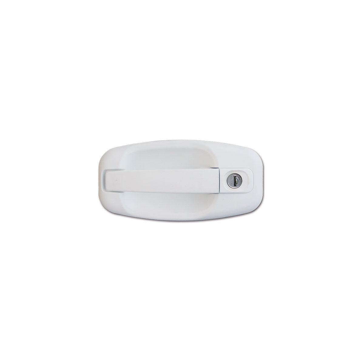 Weißer Türgriff mit Handmulde für Wohnmobile, inklusive modernem Hochsicherheitszylinder und zwei Schlüsseln. STAR M1 FF-System HSC (New System) Höhe: 230 mm Breite: 115 mm Lieferumfang: Türgriff inkl. Schlüssel & Zylinder