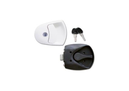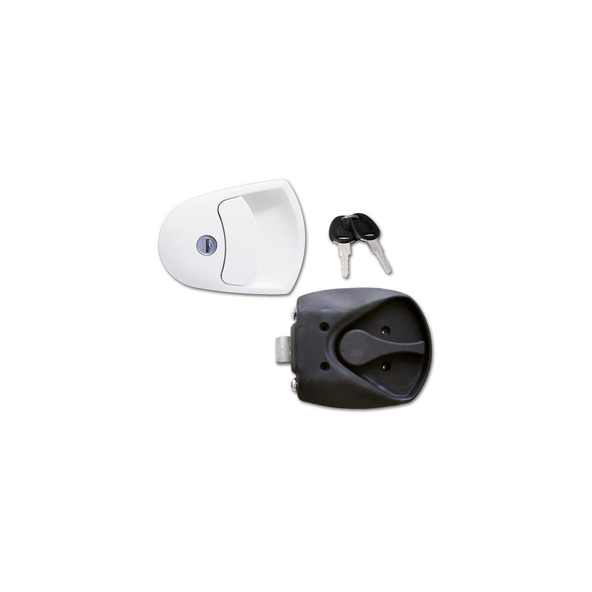 FAP Türschloss mit Griffmulde für Wohnmobil und Wohnwagen. Technische Daten: FF-System: HSC (New System) CEE -M1 Farbe: Außen: Weiß Innen: Schwarz Maße: Außen: H 120 x B: 150 mm Innen: H 145 x B: 155 mm Lieferumfang: Griff außen & innen Zylinder & 2x Schlüssel