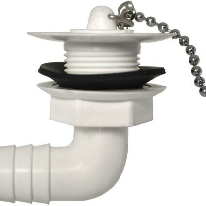 Kunststoffablaufventil mit Schraubanschluss. Komplett mit Stopfen, Kettchen und Dichtung. Schlauchanschluss ø 19 mm. Technische Daten: Ausführung: Abgang 90° Für Ablauf löcher mit 25 – 35 mm ø. Maße (L x B x H): 12,4 × 11,6 × 4,1 cm Gewicht: 29 g Farbe: weiß Material: Kunststoff Lieferumfang: 1 Ablaufventil mit Stopfen, Kettchen und Dichtung