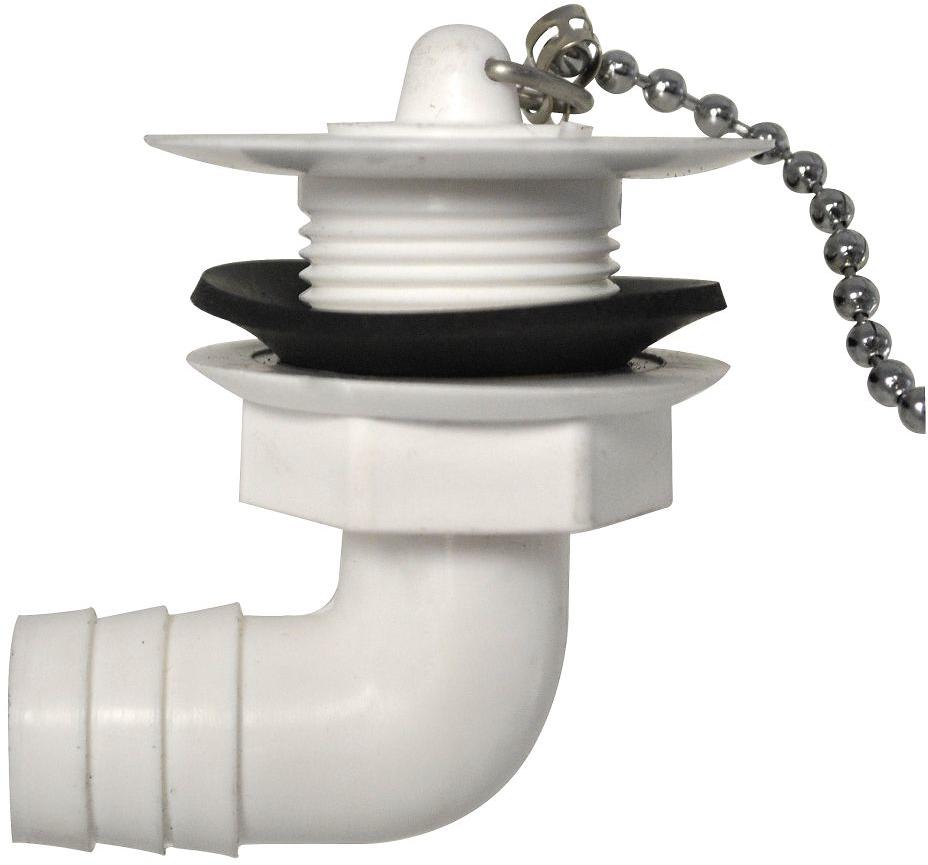 Kunststoffablaufventil mit Schraubanschluss. Komplett mit Stopfen, Kettchen und Dichtung. Schlauchanschluss ø 19 mm. Technische Daten: Ausführung: Abgang 90° Für Ablauf löcher mit 25 – 35 mm ø. Maße (L x B x H): 12,4 × 11,6 × 4,1 cm Gewicht: 29 g Farbe: weiß Material: Kunststoff Lieferumfang: 1 Ablaufventil mit Stopfen, Kettchen und Dichtung