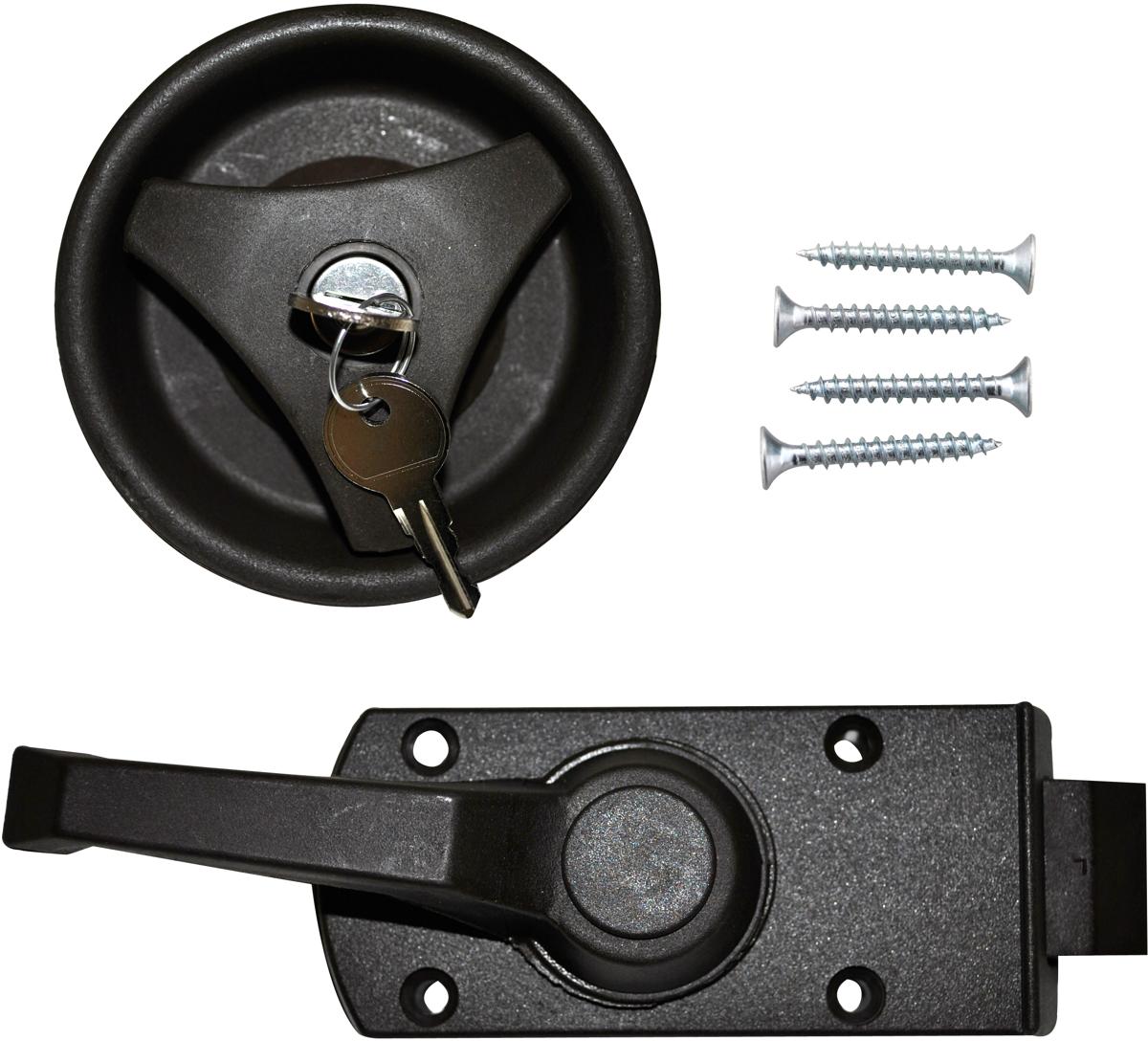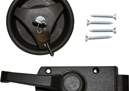 Caravan Türschloss mit EURO-Innensicherung. Technische Informationen: Innenschloss: B 120 x H 55 mm Ausschnittmaß: ø 90 mm Farbe: dunkelbraun Wandstärke: 23 – 35 mm Material: Kunststoff Lieferumfang: Innen- & Außenteil FF1 Metallschließzylinder Mit Dichtring 2 Schlüsseln 4 Montageschrauben.