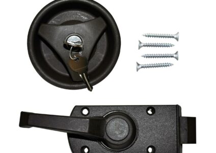 Traditionelles Caravan Türschloss mit Metallschließzylinder und EURO-Innensicherung. Technische Informationen: Innenschloss: B 120 x H 55 mm. Ausschnittmaß: ø 90 mm Farbe: schwarz Für Wandstärke: 23 – 35 mm Material: Kunststoff Nettogewicht: 247 g Lieferumfang: Dichtring Zylinder 2 Schlüsseln 4 Montageschrauben.
