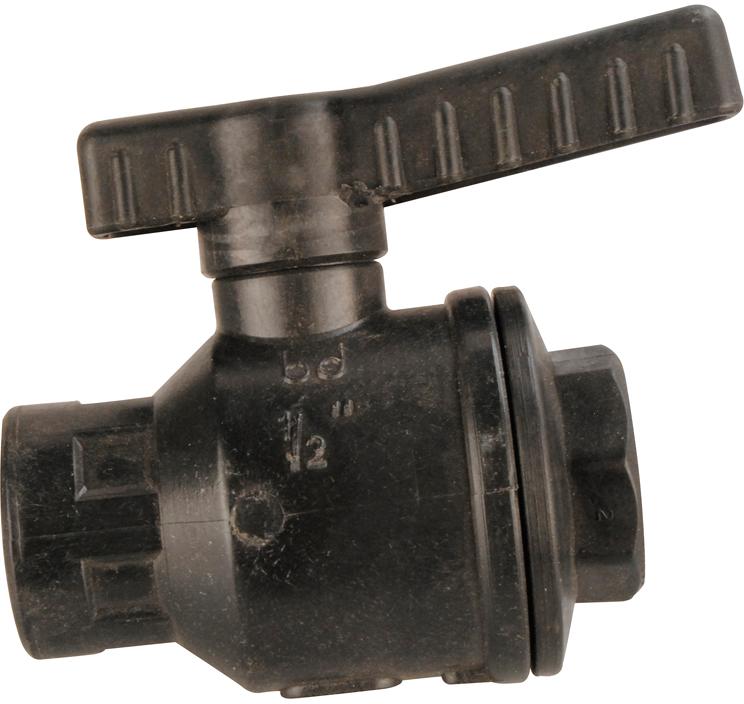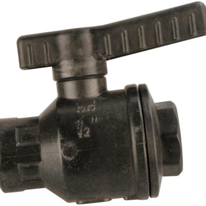 Kugelhahn mit beidseitigem Rohrinnengewinde. Gewindeanschluss. Technische Daten: Material: Kunststoff Größe: 1“ Maße (L x B x H): 16,9 × 15,9 × 5,6 cm Gewicht: 155 g Farbe: schwarz