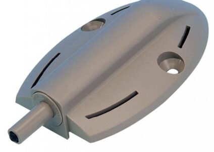 Türdämpfer und Aufschraublager mit Frontanschlag-Steg. Luftgedämpft. Durchm. 10 mm. Farbe Grau.