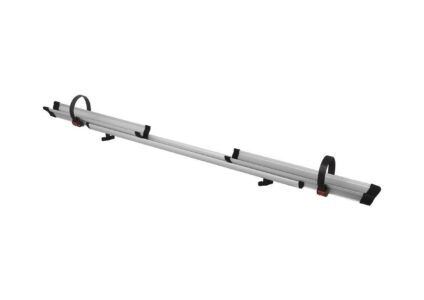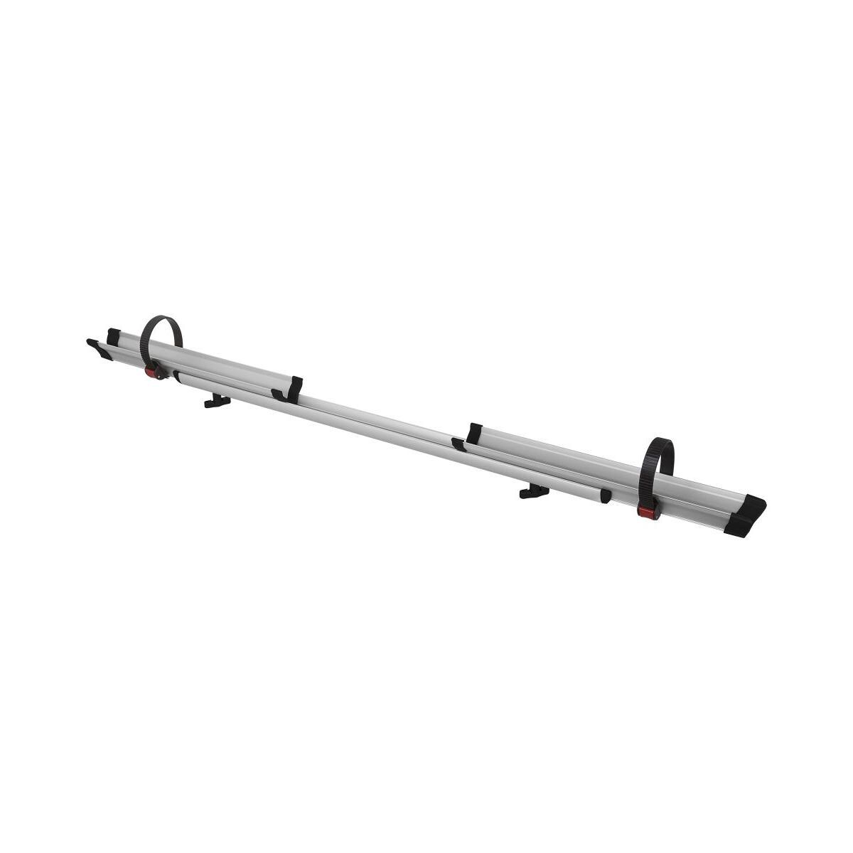 Teleskopierbare Schiene mit 2 Quick-Safe Riemen. Variabel einstellbare Breite für fast alle Modelle. Bitte achten Sie auf das Gleichgewicht bei der Beladung. Technische Daten: Sekundärfarbe: schwarz Farbe: silber Ausziehbar: 101 – 150 cm Länge: 101 cm Packmaß: 95 × 10 × 6 cm Gewicht: 1,2 kg