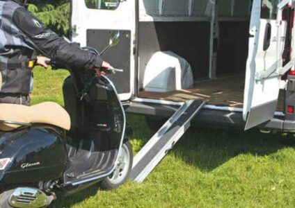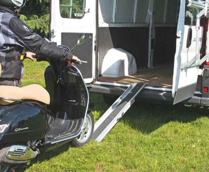 Auffahrschiene aus eloxiertem Aluminium mit Haftbeschichtigung für Fahrzeuge mit Heckgarage. Nach der Montage der Halterung im Fahrzeug wird die Auffahrschiene problemlos ein- und ausgehängt. Ausziehbar bis zu 175 cm. Serienmässig mit seitlichem Trageriemen für den Transport. Durch das Verbinden von den zwei Teilen des Carry-Ramp kann man einfach ein Rampensystem schaffen, um zum Beispiel Rollstühle zu beladen. Fahrzeugmodell: für Reisemobil-Kastenwagen Teleskopierbar Winkel: fest, 25° Max. Tragkraft:…