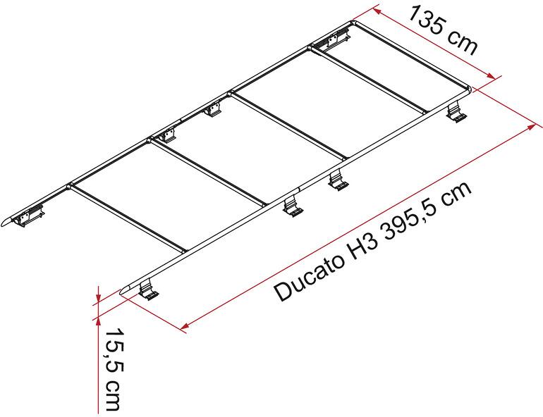 Dachreling für den Fiat Ducato – das Fiamma Roof Rail fürs Hochdach H3 Nachrüstbares Dachträgersystem für den Fiat Ducato nach Bj. 06/2006. Mit serienmäßigen Halterungen zur Anbringung einer Fiamma F65S / F80S Markise. Die maximale Zuladung der einzelnen Schiene beträgt 25 kg. Zum Stabilisieren des Fiamma Roof Rail gibt es als optionales Zubehör den paarweise erhältlichen Fiamma Roof Rail Ducato Kit (Art.: 19389). Roof Rail für den Fiat Ducato ab Bj. 2006: mit Hochdach H3 – in den Längen L3 und L4…