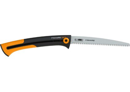 Eine Handsäge von Fiskars mit grober Zahnung. Das Sägeblatt mit Zugzahnung aus gehärtetem Stahl kann komplett im Griff versenkt werden. Die Säge ist somit für Reisen, 4×4 und Camping geeignet. Mit praktischem Gürtel-Clip, welcher bei Nutzung der Säge eingezogen ist. Der orange Griff ist gut sichtbar und mit rutschfester Oberfläche für komfortables und sicheres Sägen ausgestattet. Inklusive Fingerschutz, der ein Abrutschen der Finger verhindert. Fingerschutz Grobzahnung gehärteter Stahl Sägeblatt kann…