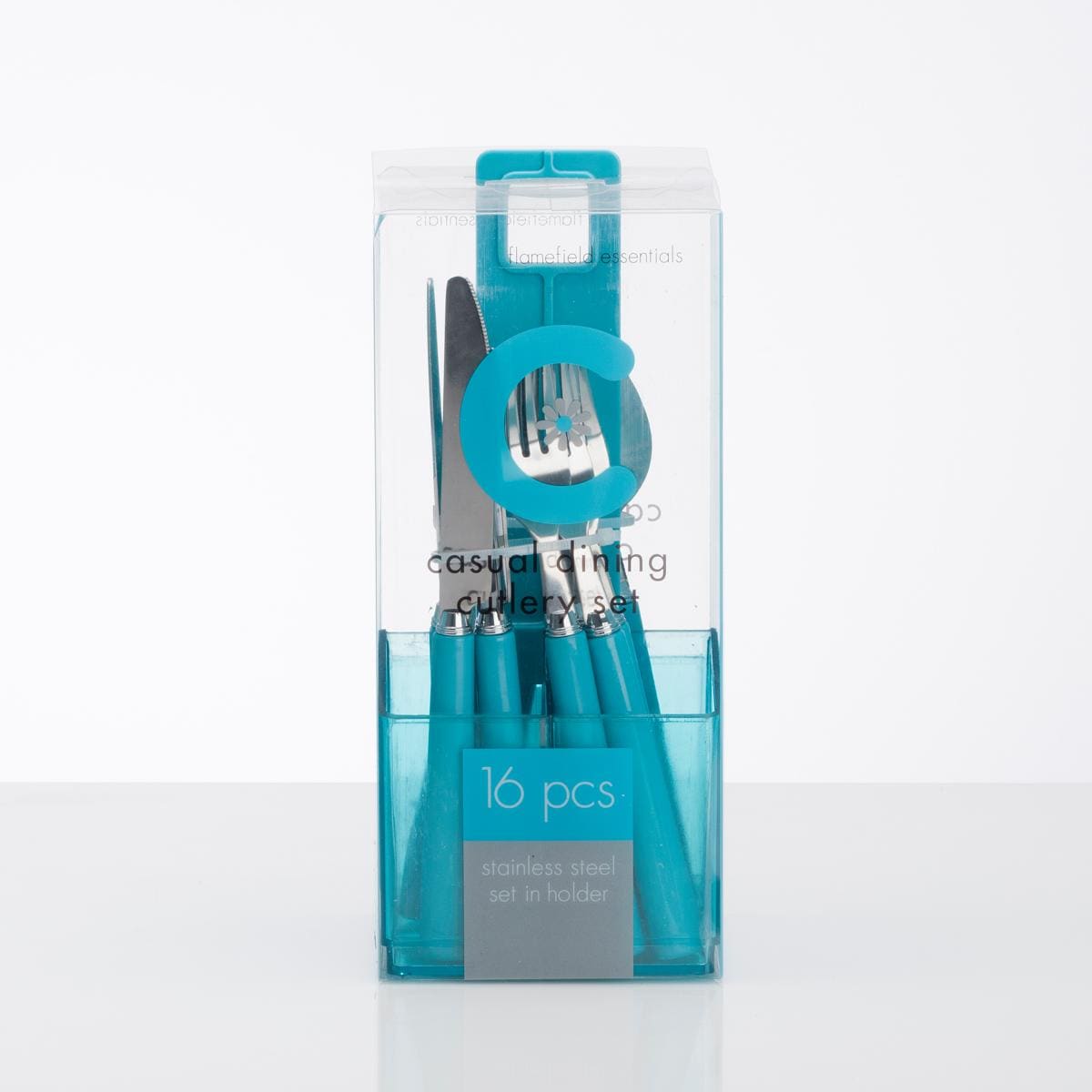 Flamefield 16-teiliges Besteck aus Edelstahl in Halterung mit farbigen, abgerundeten, quadratischen Kunststoffgriffen, die angenehm zu halten sind. Dieses hochwertige und stilvolle Set für vier Personen eignet sich perfekt für Mahlzeiten im Freien. Technische Daten: Farbe: Aqua Granite Lieferumfang: 4 Messer 4 Gabeöm 4 Löffel 4 Teelöffel