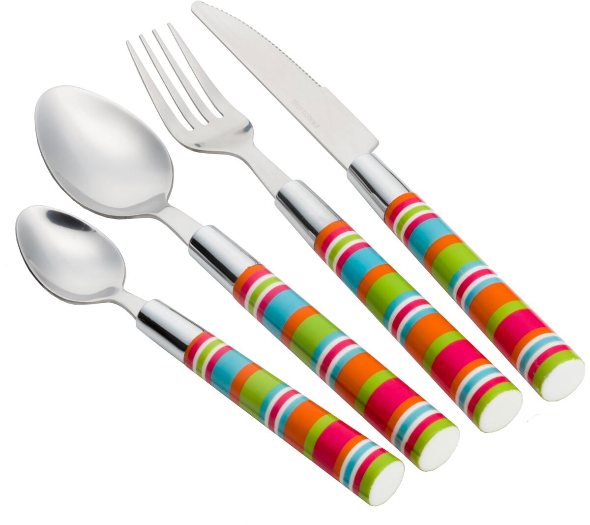 Flamefield 16-teiliges Besteck aus Edelstahl in Halterung mit farbigen Kunststoffgriffen, die angenehm zu halten sind. Dieses hochwertige und stilvolle Set für vier Personen eignet sich perfekt für Mahlzeiten im Freien.Technische Daten:Farbe: bunt gestreiftLieferumfang:4 x Messer4 x Gabel4 x Löffel4 x Tee-Löffel