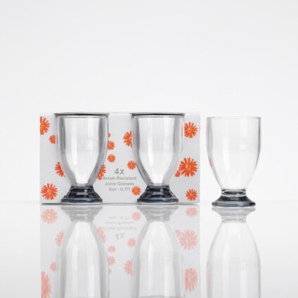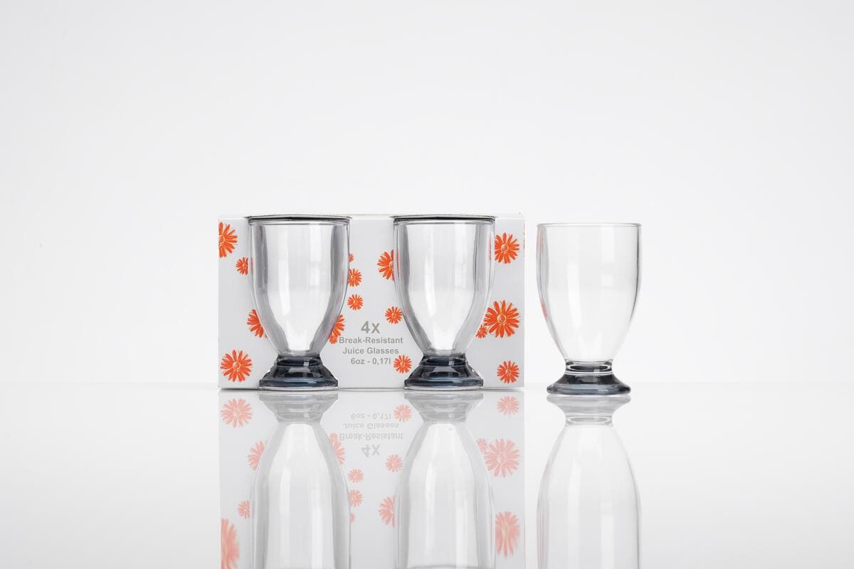 Schönes Saftglas mit grauer Basis. Ideal zum Servieren von Säften und kalten Getränken. Technische Daten: Kapazität: 170 ml Material: Acryl Farbe: transparent, grau Lieferumfang: 4 Saftglas