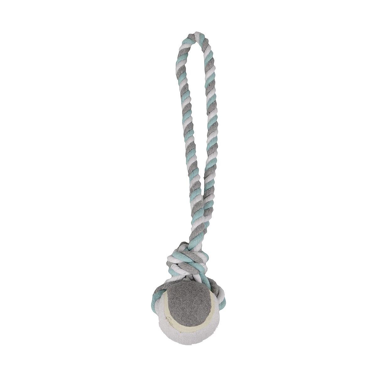 Baumwoll-Spielseil JIM mit Tennisball für intensive Aktivität mit Ihrem Hund. Technische Daten: Material: Baumwolle, Polyester, Gummi Gewicht: 160 g Länge: 39 cm