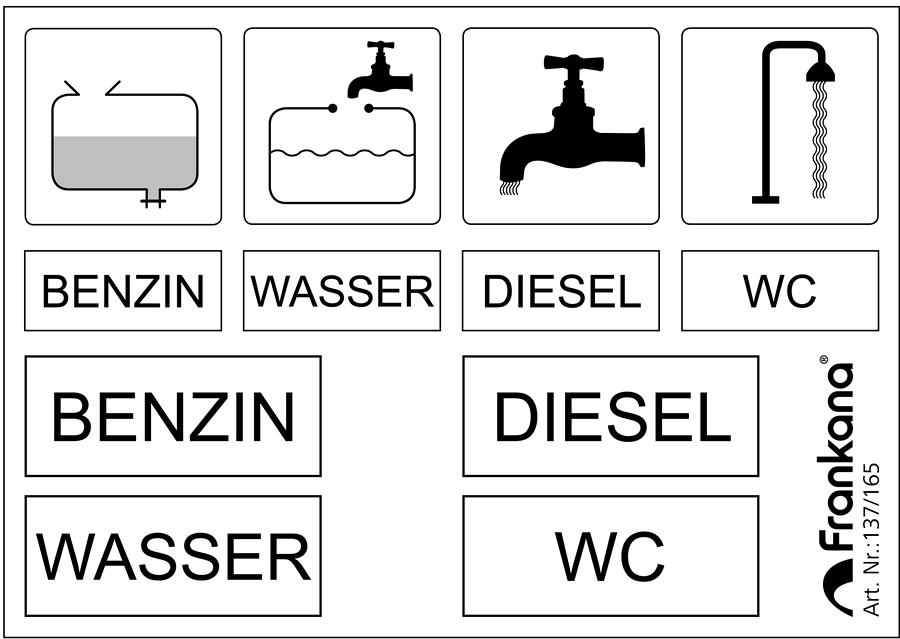 Aufkleber (Bogen DIN A6) für wichtige Symbole im Campingbereich. Abwasser, Frischwasser, Wasseranschluss, Duschwasseranschluss, Benzin, Diesel, Wasser, WC. Technische Daten: Die Piktogramme sind 35 x 35 mm Die Textschilder 50 x 20 mm und 35 x 15 mm
