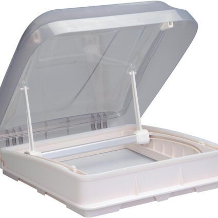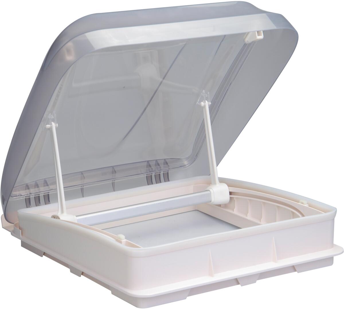 Aerodynamische Dachhaube inklusive Verdunkelung und Moskitoschutz Doppelverglasung aus Acryl – UV-beständig mit Plisseerollo zur Verdunkelung mit Moskitonetz (Fliegengitter) Magnetfunktion 2 Aufsteller für sicheres und gleichmäßgiges Öffnen Öffnung in zwei Stufen ohne Zwangsbelüftung Technische Daten: Ausschnittmaß 402 x 402 (mm) Abmessungen: 513 x 513 x182 (mm) Dachstärke: 28 – 50 mm