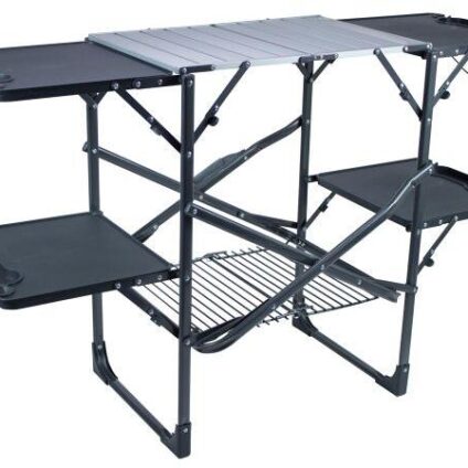 Ausgestattet mit der patentierten Slim-Fold Technology™ lässt sich die Slim-Fold Cook Station mit wenigen Handgriffen auf- und abbauen und kompakt zusammenfalten. Eine Ablage zur Aufbewahrung, die hitzebeständige Arbeitsplatte aus Aluminium und die vier ausklappbaren Kunststoff-Beistelltische machen die Cook Station zum perfekten Begleiter für Ihren nächsten Campingausflug. Die Beistelltische sind mit Getränkehaltern, Stielglashaltern und Haken ausgestattet, die als Müllsack- oder Papierhandtuchhalter…