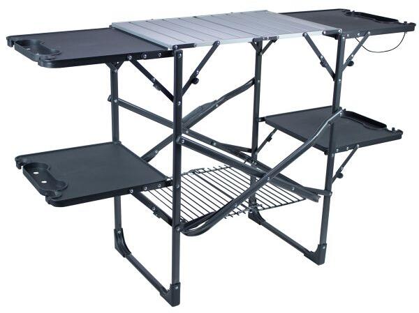 Ausgestattet mit der patentierten Slim-Fold Technology™ lässt sich die Slim-Fold Cook Station mit wenigen Handgriffen auf- und abbauen und kompakt zusammenfalten. Eine Ablage zur Aufbewahrung, die hitzebeständige Arbeitsplatte aus Aluminium und die vier ausklappbaren Kunststoff-Beistelltische machen die Cook Station zum perfekten Begleiter für Ihren nächsten Campingausflug. Die Beistelltische sind mit Getränkehaltern, Stielglashaltern und Haken ausgestattet, die als Müllsack- oder Papierhandtuchhalter…
