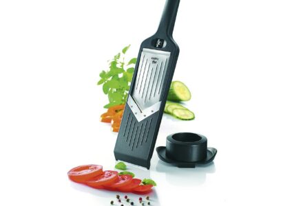 Kompakter Gemüsehobel Violi mit Edelstahlring zum Aufhängen an der Küchenreling. Mit einer Klinge aus japanischem Klingenstahl. Fünf Schnittstärken von 1 bis 5 mm sind einstellbar. Keine Verletzungsgefahr dank Sicherheitseinstellung. Rutschfeste Füße aus ABS-Kunststoff für festen Halt. Handlich durch die kompakte Größe, ist der V-Hobel VIOLI® mit den einfach einstellbaren 5 Schnittstärken der perfekte Küchenpartner für jeden Tag. kompakter V-Hobel mit Restehalter auswechselbare Klinge aus japanischem…