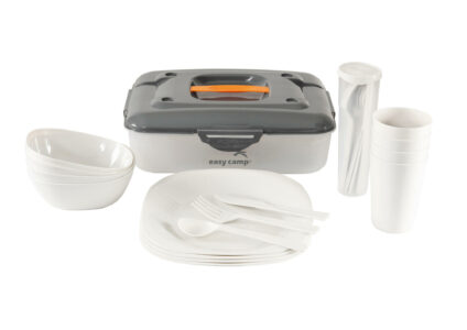 Ein vollständiges Geschirrset für vier Personen, das du in der Transportbox überall mit hin nehmen kannst.