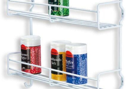 Regal mit 2 Etagen aus Metall, kunststoffummantelt zum sicheren Aufbewahren von Gewürzen oder Gläsern. Einfache Montage. Mit zwei praktischen Haken (Lieferung ohne Gewürze). Technische Daten: Material: Edelstahl, Kunststoff Maße (B x T x H): 30 × 7 × 22 cm Gewicht: 305 g