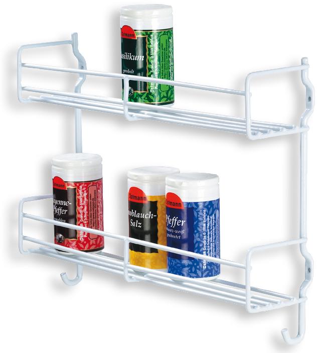 Regal mit 2 Etagen aus Metall, kunststoffummantelt zum sicheren Aufbewahren von Gewürzen oder Gläsern. Einfache Montage. Mit zwei praktischen Haken (Lieferung ohne Gewürze). Technische Daten: Material: Edelstahl, Kunststoff Maße (B x T x H): 30 × 7 × 22 cm Gewicht: 305 g