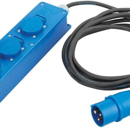 CEE/Schuko Steckerleiste mit 3 Steckdosen und 5 Meter Neoprenkabel. Technische Daten: Farbe: Schwarz/blau Kabellänge: 5 m Maße (L x B x H): 22 x 42,5 x 11 cm Gewicht: 1,36 kg