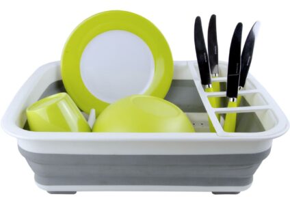 Perfektes Abtropfgestell für Geschirr mit viel Platz. Wenn es zusammengeklappt ist, beträgt die Höhe nur noch 1/3 und ist somit perfekt zu verstauen. Perfekt für unterwegs, wenn man wenig Platz in der Küche hat. Wenn man das Sieb reinigen möchte , kann es auch zu Hause im Geschirrspüler gereinigt werden Technische Daten: Maße aufgeklappt: 37,5 x 29,2 x 12,5 cm Maße zusammengefaltet: 37,5 x 29,2 x 4,5 cm Gewicht: 590 g Farbe: grau, weiß Hinweis: Das Abtropf-Gestell ist unten offen, damit das Geschirr gut…