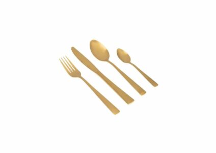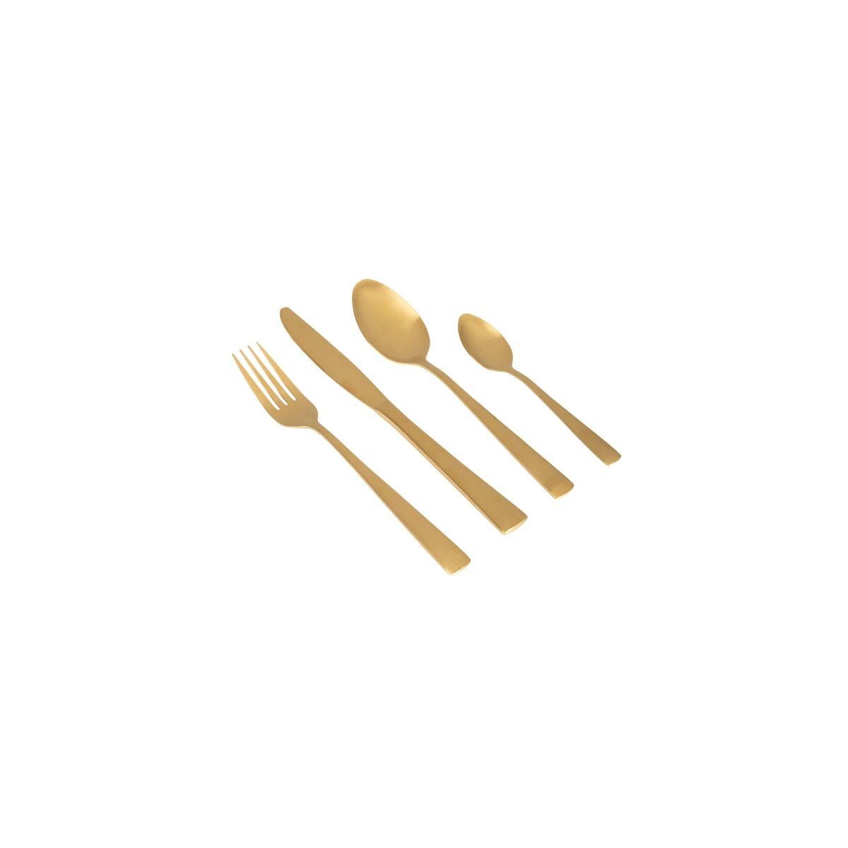 Besteckset, 16-tlg., aus 18/0 Edelstahl mit Messer, Gabel, Löffel und Teelöffel. Technische Daten: Material: Edelstahl Nettogewicht: 820 g Packmaß: 25,5 x 17 x 6,5 cm Farbe: gold Lieferumfang: 4 Gabel 4 Messer 4 Löffel 4 Teelöffel