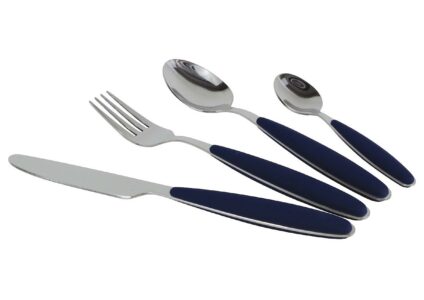 Besteckset aus Edelstahl 18/0 mit Messer, Gabel, Löffel, Teelöffel und softem Griff. Passend zur GreyLine und Rainbow Serie. spülmaschinengeeignet Technische Daten: Farbe: dunkelblau Material: Edelstahl + Kunststoff Maße (B x T x H): 170 × 65 × 255 mm Gewicht: ca. 600 g Lieferumfang: 4 Messer 4 Gabel 4 Löffel 4 Teelöffel
