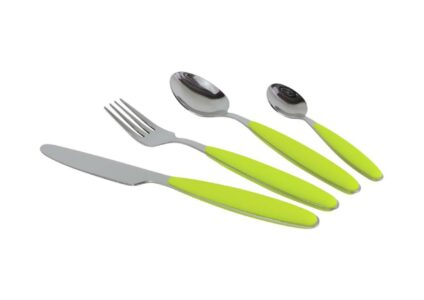 Besteckset aus Edelstahl 18/0 mit Messer, Gabel, Löffel, Teelöffel und softem Griff. Passend zur GreyLine und Rainbow Serie. spülmaschinengeeignet Technische Daten: Farbe: grün Material: Edelstahl + Kunststoff Maße (B x T x H): 170 × 65 × 255 mm Gewicht: ca. 600 g Lieferumfang: 4 Messer 4 Gabel 4 Löffel 4 Teelöffel Hinweis: Die Farbe kann ein gelbliche Nuance aufweisen.