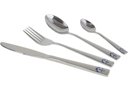 Ein stilvolles Besteckset aus Edelstahl aus der Marine Line Kollektion. Das Besteck hat eine silberne Farbe und einen kleinen Anker Akzent auf dem Griff. Das Besteck liegt bequem in der Hand. Das Set besteht aus 4x Messer, Gabel, Löffel und Teelöffel und ist auch spülmaschinenfest. Besteckset aus Edelstahl Spülmaschinenfest Technische Daten: Material: Edelstahl 18/0 Packmaß (BxHxT): 17 x 25,5 x 6 cm Lieferumfang: 4 Messer 4 Gabel 4 Esslöffel 4 Kaffeelöffel
