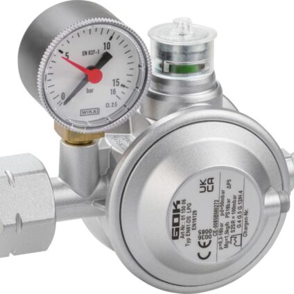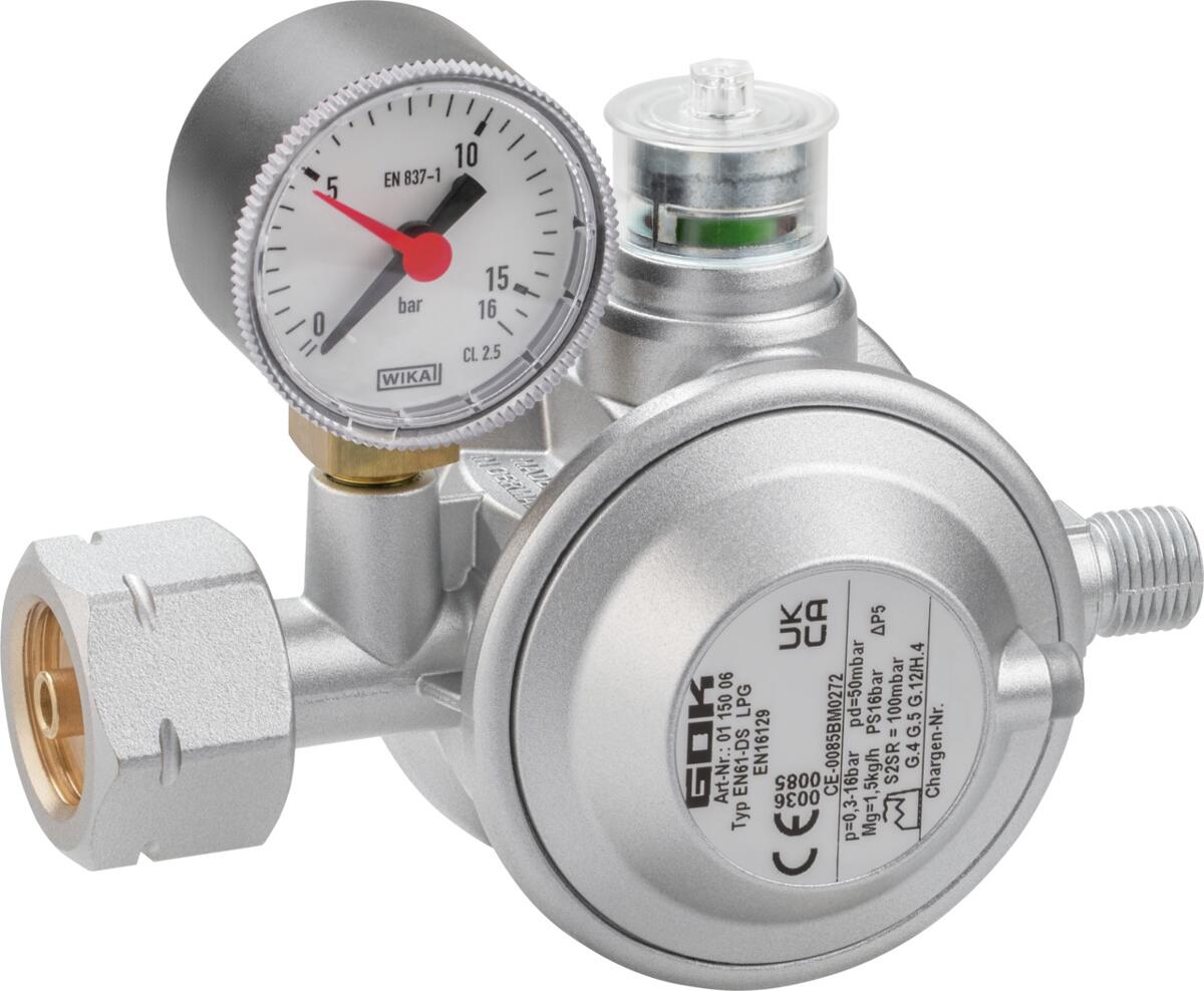 GOK Gasregler EN61-DS (Komb. A x G 1/4 LH-KN), 1,5kg/h, 29mbar, mit Manometer, gerade