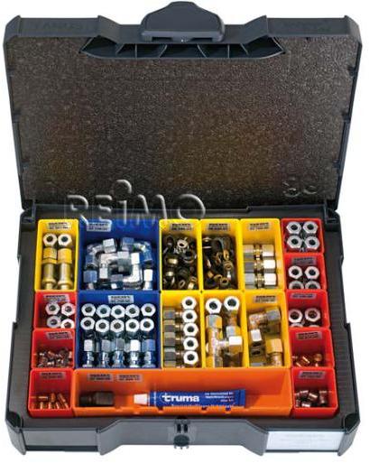 Alle zur Montage bzw. zur Wartung bei Freizeitfahrzeugen erforderlichen Komponenten in einem Systemkoffer aus hochwertigem ABS Kunststoff. Technische Daten: Material Koffer:ABS-Kunststoff Maße H/B/T: ca. 105 x 395 x 295 mm bestehend aus: 15 x Gerade Verschraubung Typ G 8 mm 5 x Gerade Verschraubung Typ G 10 mm 15 x Winkel-Verschraubung Typ W 8 mm 5 x Winkel-Verschraubung Typ W 10 mm je 5 x T-Verschraubung Typ T 8 und 10 mm 4 x Gerade Reduzierverschraubung Typ GR 10 x 8 mm 4 x Gerade Schottverschraubung…