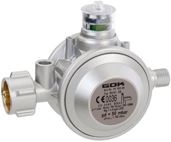Gasregler zum Anschluss an Gasflaschen, zur Druckregelung auf den Nenndruck des Gasgerätes.Überdruck-Sicherheitseinrichtung S2SR (ÜDS) zur Absicherung der Verbrauchsgeräte vor unzulässig hohem DruckSichtanzeige (grün/rot) mit optischem Signal (rot) bei Ausgangsdrücken über 80 mbarTechnische Daten:Typ: EN61-DSAnschluss Gas: KLF x G 1/4 LH-KNBetriebsdruck: 30 mbarmax. Druck: PS: 16 barLeistung: 1,5 kg/hAbhang: geradeohne ManometerNettogewicht: 470 g