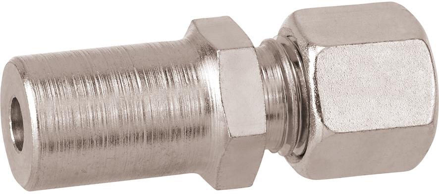 Verbindungs-Reduzierverschraubung in Anlehnung an EN ISO 8434-1, einerseits Rohrstutzen RST mit Außendurchmesser, andererseits Schneidringverschraubung Technische Daten: Typ: RED – RST 10 x RVS 8 Material: Stahl Gewicht: 35 g