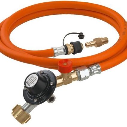 Zum Anschluss an Gasflaschen, für den Betrieb von Gasgrills mit einem Gaskartuschen-Anschluss. Mitteldruckregler Typ M50-F/SBS, 2,0 bar, 2 kg/h mit Abgang 35° und integrierter Schlauchbruchsicherung EFV (SBS) mit manueller Öffnung, sperrt bei Schlauchbeschädigung die Gaszufuhr ab Mitteldruck-Schlauch (Gummi mit Textileinlage, kältebeständig bis -30 °C, Schlauchabmessung 6,3 x 3,5 mm) G 3/8 LH-ÜM x Steckkupplung SKU Übergangsstück mit einerseits Stecknippel STN zum einfachen Lösen der Schlauchleitung,…