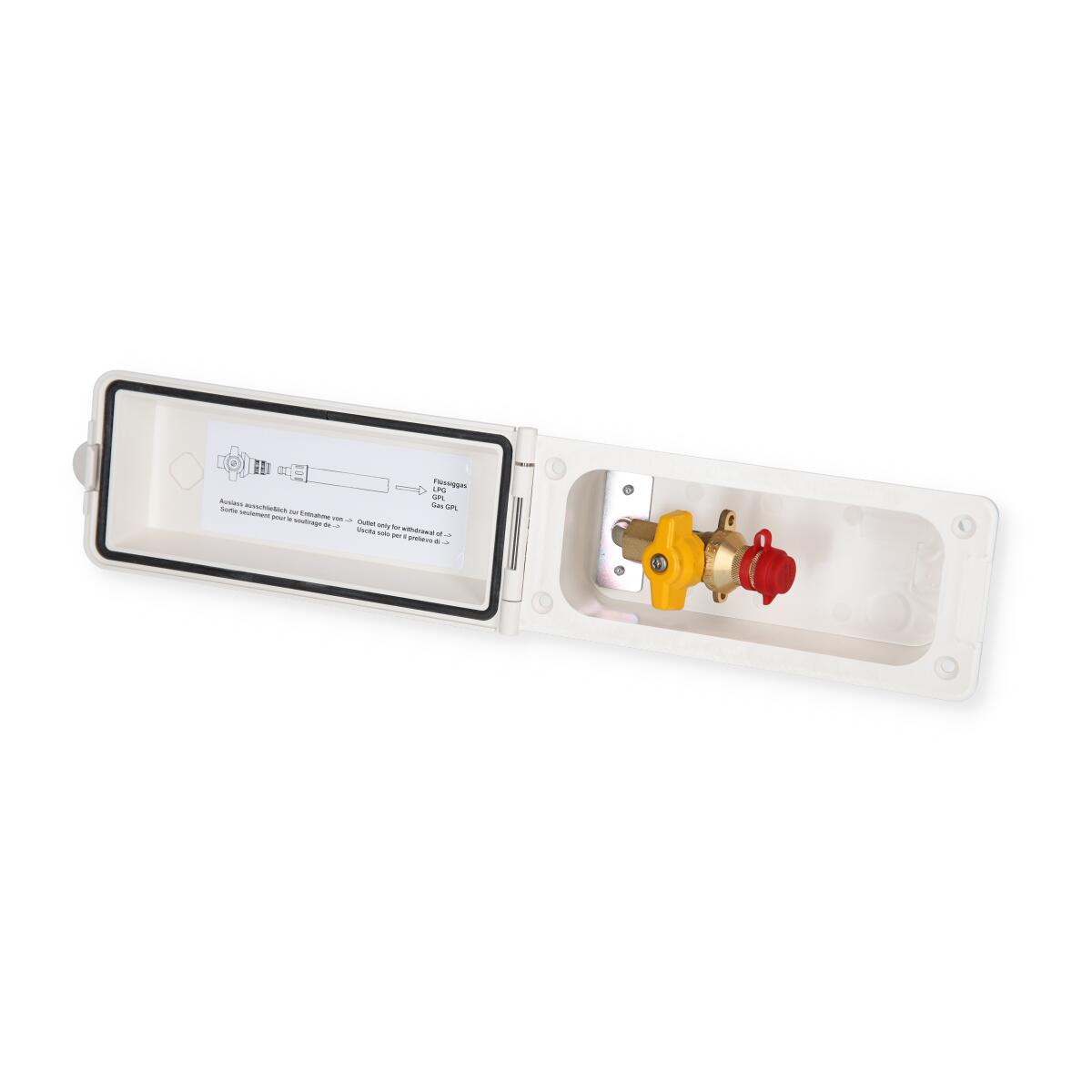 Versorgungsklappen für den zusätzlichen Anschluss von Gasgeräten, z. B. Kocher, Grill, Leuchten … oder Wasser. Öffnen des Ventils nur bei angeschlossener Schlauchleitung möglich. Für Ausschnitt 155 x 65 mm. Gasanschluss SKU x RST 8 mm.