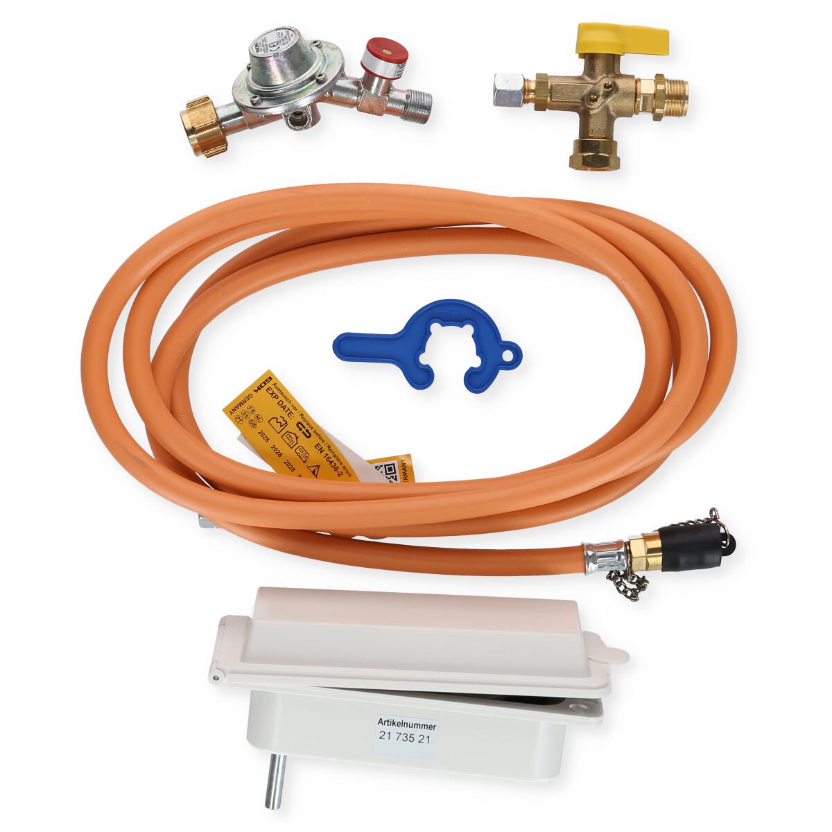 GOK Versorgungsklappenset inkl. Gasregler, Gasschlauch, Umschaltventil, MiniTool