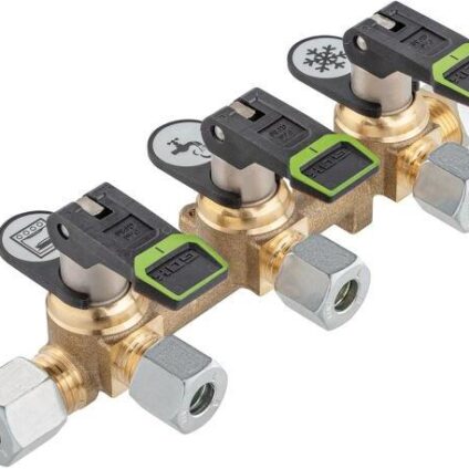 Verteilerblock mit ergonomischem Kipphebel für einfache Bedienung. Farbliche Kennzeichnung in Grün für Offen und Rot für Geschlossen. Geringer Druckverlust dank optimierter Funktion inklusive Befestigungskonsole und Clipsen mit Symbolen zur Kennzeichnung der Verbrauchsgeräte inklusive Blindstopfen im Ausgang Dichtungen: NBR Kipphebel: PA6 GF30 mit Überwurfmutter Typ M und Schneidring Typ D Technische Daten: Typ: KSV-AB3 Anschluss: ø 10 mm max. Druck: PS16 bar