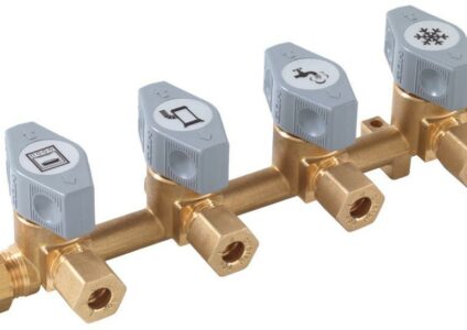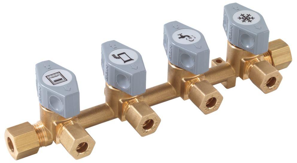 Schnellschlussarmatur nach DIN 4817-1, nur volle Offen- bzw. Geschlossenstellung. Inklusive einem Blindstopfen und Symbolen zum Aufkleben. DIN-DVGW geprüft. Mit Überwurfmutter Typ M-MS und Schneidring Typ D-MS Technische Daten: Typ: DSV-AB Material: Messing Anzahl der Ausgänge: 4 RSV 8 mm MS 5 bar Gewicht: 543 g