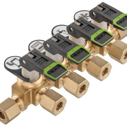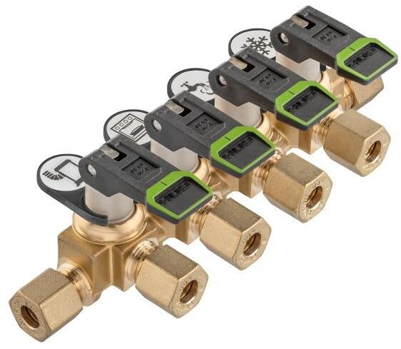 Verteilerblock Marine mit ergonomischem Kipphebel für einfache Bedienung. Betätigungselement: ergonomischer Kipphebel farbliche Kennzeichnung der Offen- (grün) bzw. Geschlossenstellung (rot) geringer Druckverlust durch optimierte Funktion mit Befestigungskonsole inklusive Clips mit Symbolen zur Kennzeichnung der Verbrauchsgeräte inklusive Blindstopfen im Ausgang DIN-DVGW-Baumusterprüfzertifikat. mit Überwurfmutter Typ M-MS und Schneidring Typ D-MS Technische Daten: Material: Messing Ausführung: kurz…