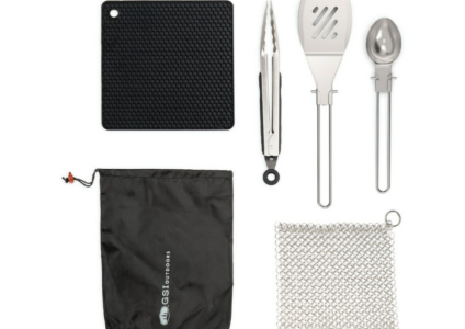 Das ultimative kompakte Kochwerkzeug-Set. Der Griff der dreistufigen Löffelkelle lässt sich umklappen, um eine kompakte Aufbewahrung zu ermöglichen, oder lässt sich zu einer Schöpfkelle oder einem Löffel ausklappen. Der Zwei-Positions-Spatelgriff lässt sich auch zur kompakten Aufbewahrung umklappen oder in einen großen Klingenspatel ausklappen. Die flache Vorderseite des Spatels dient als effizienter Schaber und großer Eierflipper. Der Kettenhemd Topfuntersetzer aus Edelstahl, schützt die Oberflächen…