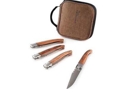 Dieses praktische Messer-Set überzeugt durch sein klassiches Design und seine hohe Qualität. Umfunktionierte Holzlaminatgriffe Scharfe Klinge gleitet mühelos Faltbare Edelstahlkonstruktion sorgt für Qualität, Haltbarkeit und Packbarkeit Technische Daten: Materialien: Edelstahl/Holz Gewicht: 67 g Abmessungen: 108 x 15,5 x 18 mm Lieferumfang: 4 klappbare Steakmesser Tragetasche mit Reißverschluss